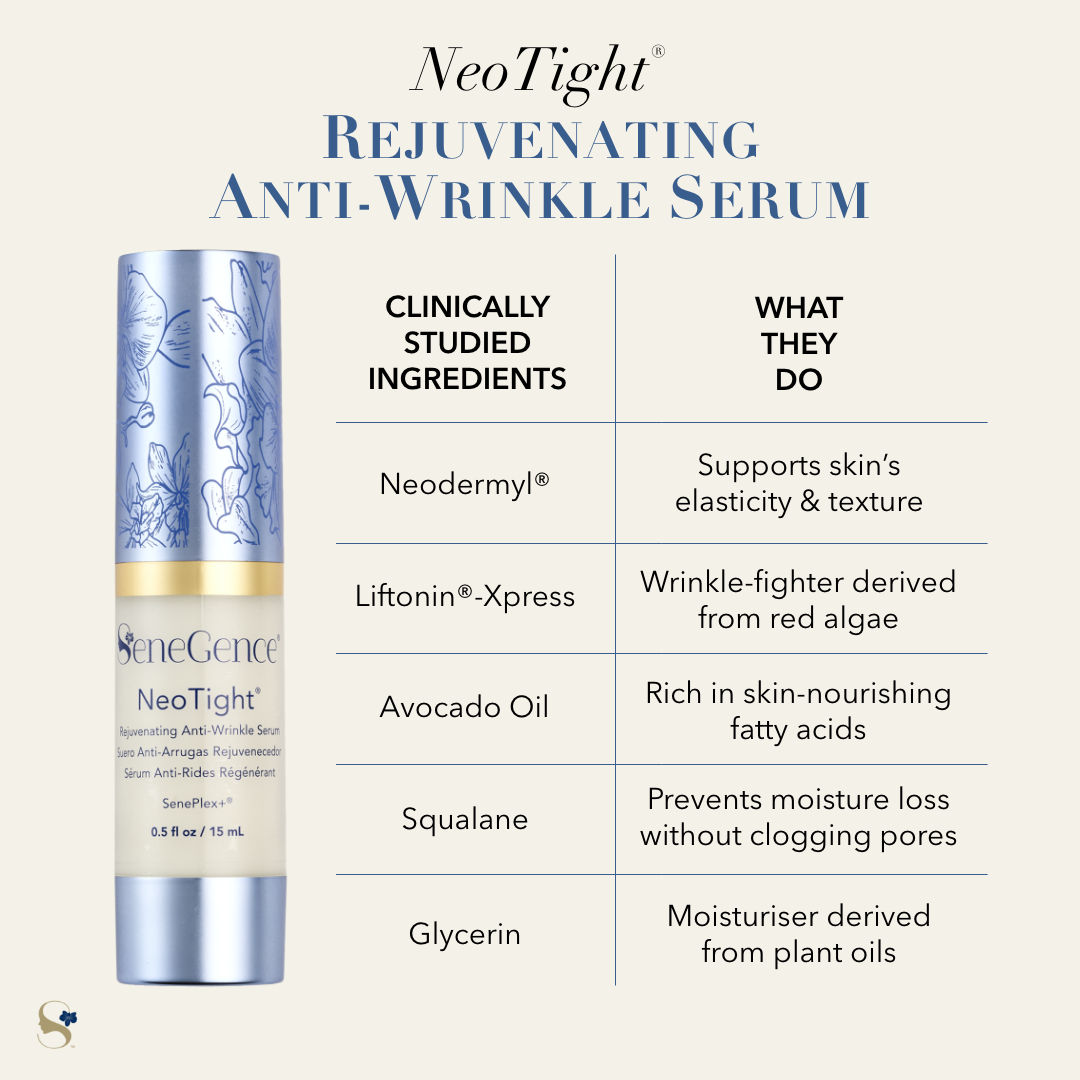 This high-performance serum dramatically reduces the appearance of fine lines and wrinkles for a youthful-looking complexion. Helps to fight stubborn signs of aging, especially around eyes (crow’s feet), mouth (nasolabial folds), and forehead (expression lines). Neodermyl®:Supports skin’s elasticity and texture for a supple, firm appearance and helps to reduce the appearance of wrinkles. SYN-STAR®:Helps to visibly diminish the appearance of wrinkles around the eyes, mouth, and forehead. Liftonin®-Xpress: Derived from red algae, this film former helps to provide a tightening and lifting effect.